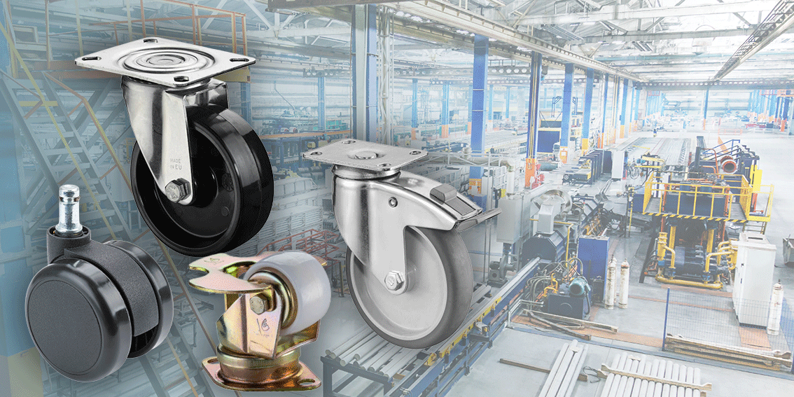 Roulettes pour le transport de marchandises ou de biens dans des caisses, des conteneurs ou sur divers supports, avec différentes résistances, par exemple à la chaleur ou aux produits chimiques.